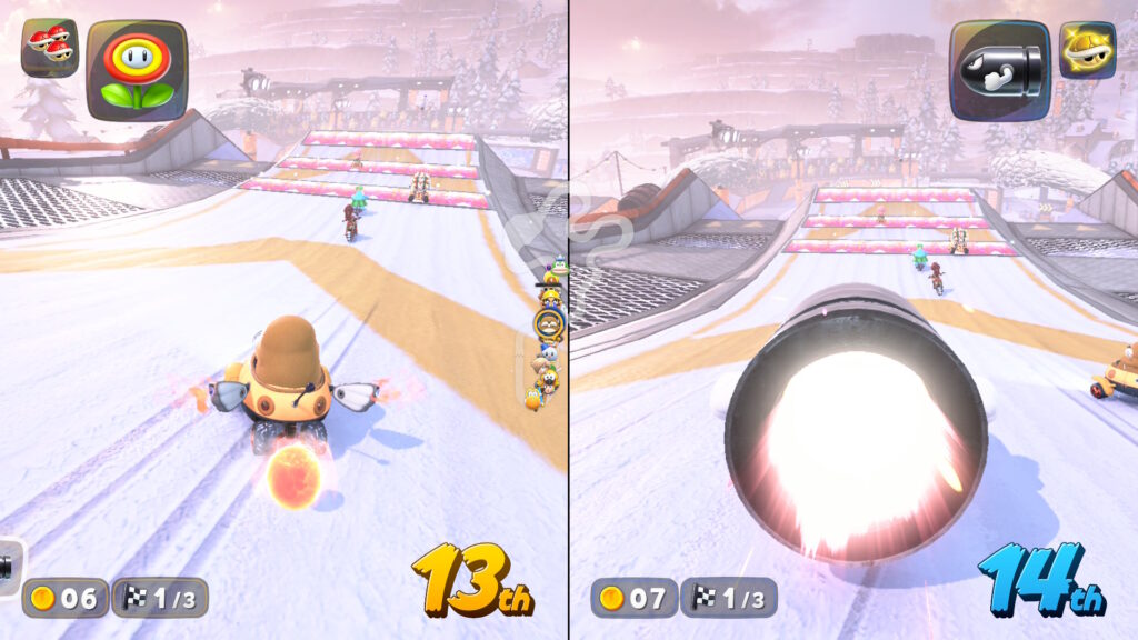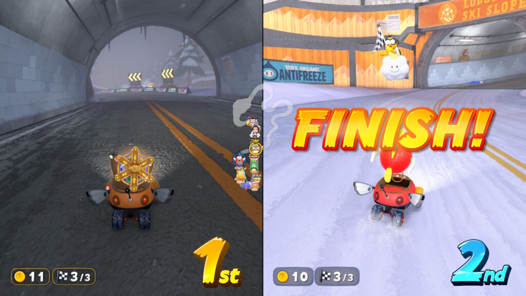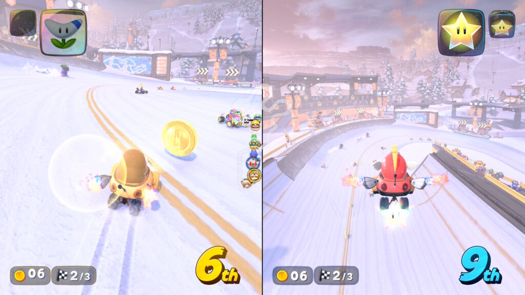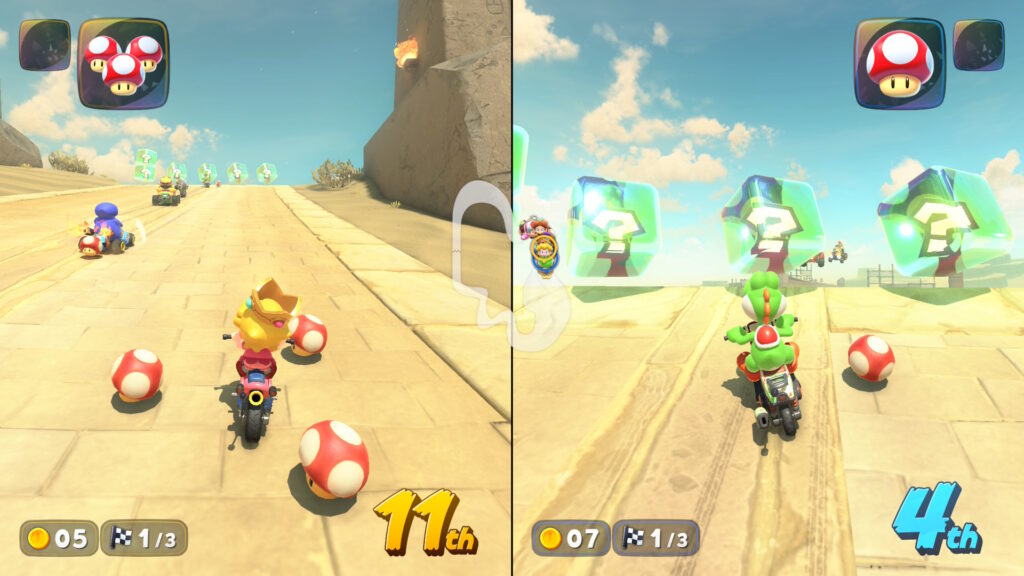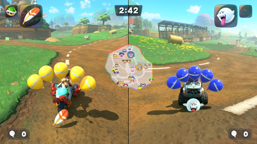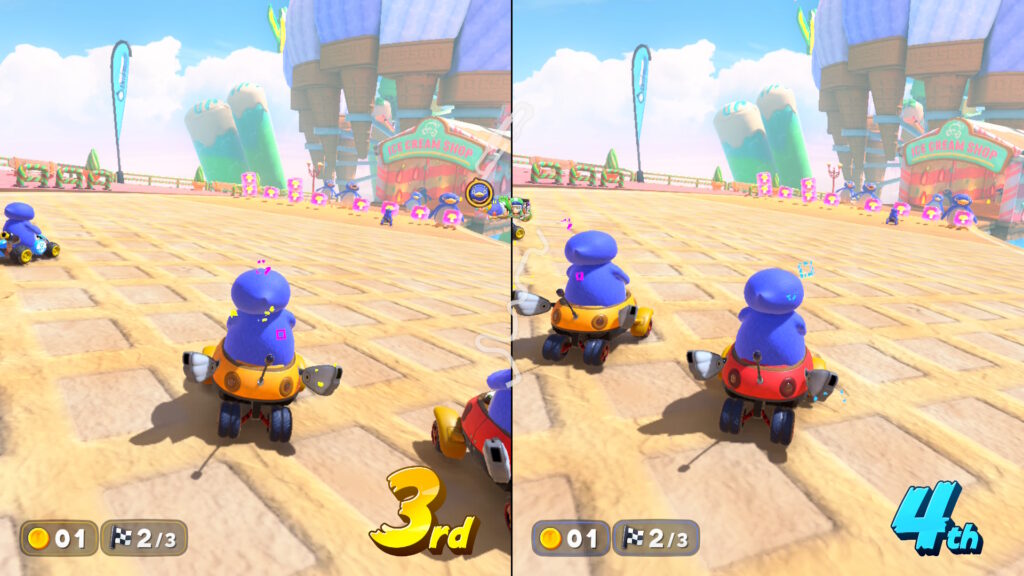 It’s to be expected since 4 distinct players need to input controls and get real-time feedback on their character, in addition to 20 others racing on the same track. The fact that a handheld device can manage 4-player split-screen in real-time is already an accomplishment. However, 2-player split-screen at 60 FPS is a marvel, with both players getting half of the display to control their respective characters.